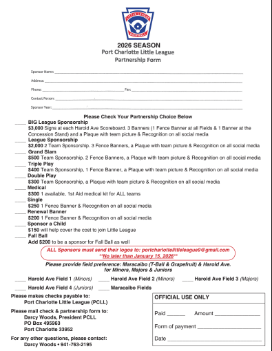 Thank you for your interest in sponsoring the Port Charlotte Little League! We could not run our league without the generous sponsorships and donations to our league. For more information on different sponsorship levels and benefits, please email portcharlottelittleleague9@gmail.com for a form or contact Darcy Woods at (941) 763-2195. The sponsorship form is also attached below for your convenience.